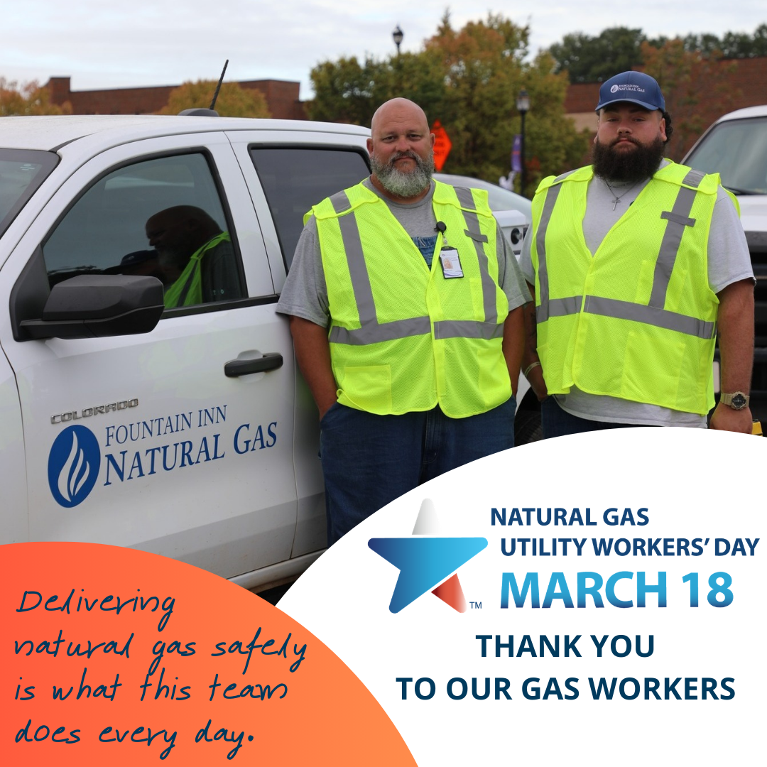 Fountain Inn, SC — On March 18, the City of Fountain Inn joins communities across the country in recognizing Natural Gas Utility Workers’ Day, honoring the dedicated professionals who safely deliver reliable natural gas service to homes and businesses every day.